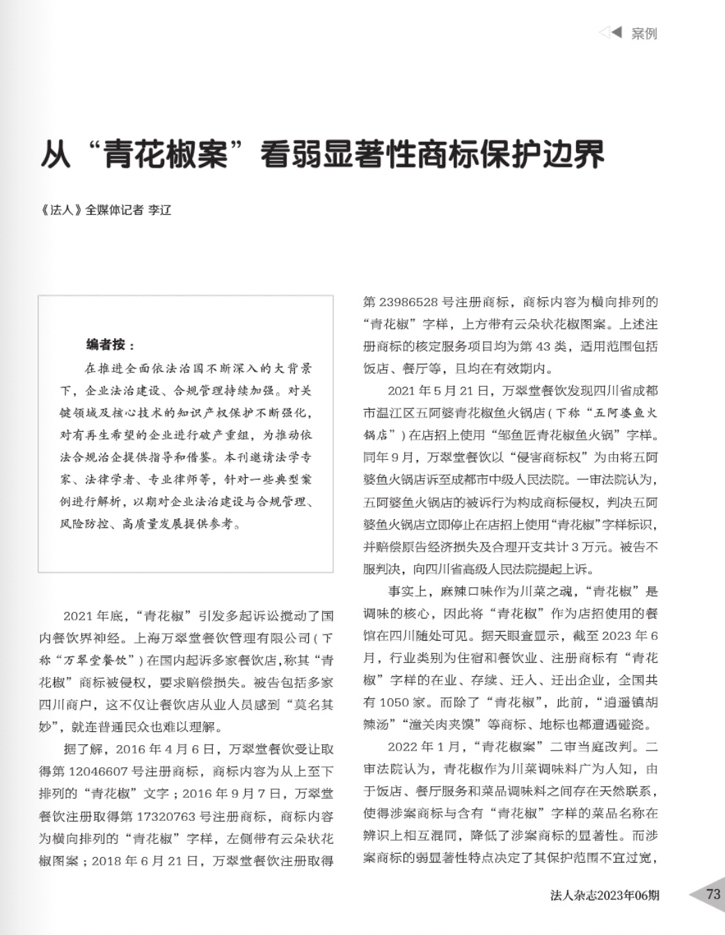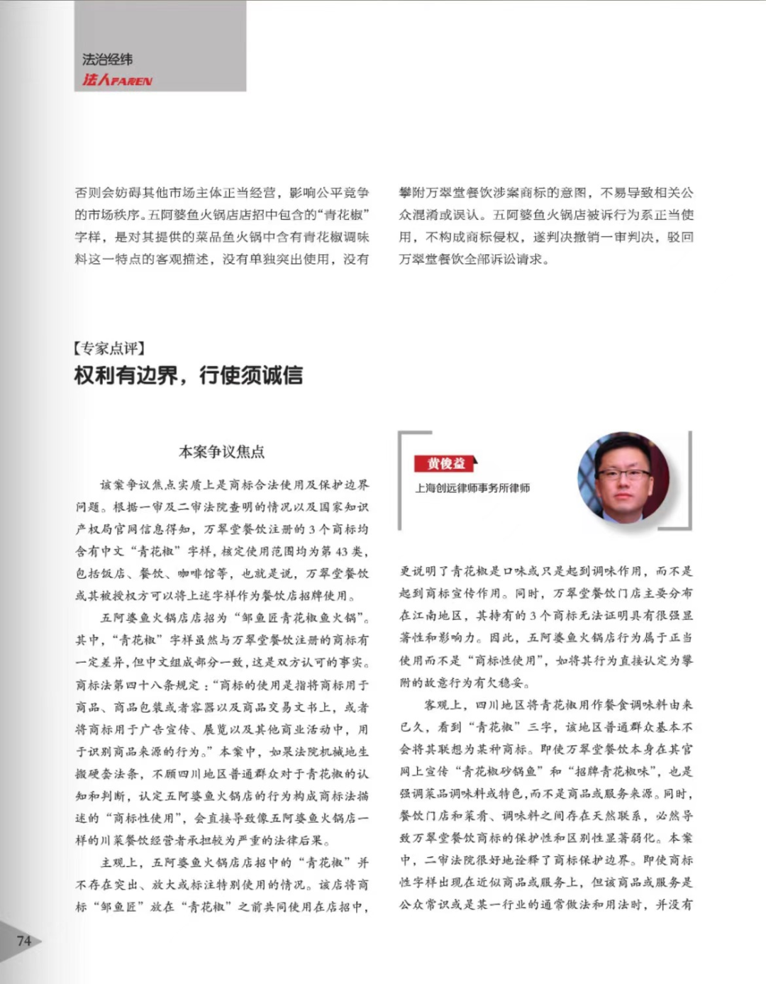 抚顺辉知简讯 | 辉知队黄俊益律师应“法治日报”旗下杂志邀请,就“青花椒”案发表专家点评